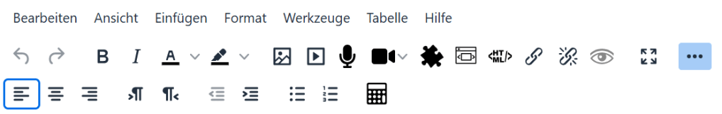 - einige Symbole sind den meisten z.B. aus Word vertraut, sie dienen der Formatierung eines markierten Textes. Da Moodle an manchen Stellen Englisch als Basissprache verwendet, steht B für Fettbuchstaben und I für kursive Schrift. Mit Klick auf das unterstrichene A lässt sich die Schriftfarbe verändern, die standardmäßig schwarz ist